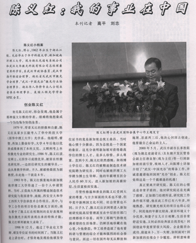陈义红小档案 陈义红,博士,1962年出生于湖北江陵。先后毕业于华中科技大学、新加坡南洋理工大学,现为湖北光通光电系统有限公司和武汉大华激光科技有限公司总经理兼首席科学家,系武汉市政协委员、武汉市海外联谊会理事、湖北省及武汉市激光学会理事、武汉中国光谷激光行业协会会长、湖北华人华侨专业人士创业者俱乐部理事长、美国工程光学学会SPIE会员。 创业陈义红 初见陈义红时,你会发现,他是属于那种温文而雅的学者,很难将他想象成一个历经艰辛的创业者。 1979年,带着无比的骄傲和自豪,陈义红从家乡江陵考入了华中科技大学(原华中理工大学)光学系。他聪明、睿智,再加上勤奋好学,大学4年后他以优异成绩拿到了大学本科文凭,又顺利考上本校激光专业的研究生。1986年,陈义红读完硕士,又因学习成绩优异,被留校激光研究所,一边担任研究生的辅导员,一边从事教学科研。不久,被破格提拔为副教授,在此他一干就是8年。 1993年冬,陈义红慎重地向新加坡南洋理工大学传递了一份个人申请资料。当时,正值南大所属的精迪制造技术研究院(现改名为新加坡制造技术研究院)与我国清华、南航、西安交大和华工四所大学洽谈技术合作项目。其中,与华工合作的项目恰恰是激光方面的,南大看中了陈义红在校期间的良好表现和他在激光方面所表现出来的特殊才能,陈义红顺利被南大录取了。 1998年11月,通过了毕业论文答辩,颁发学位证书的时间到了。当陈义红走上讲台时,才惊奇地发现给他颁发学位证书的竟是新加坡总统王鼎昌,当时他心情十分激动。因为总统是一个国家的象征,这充分表明新加坡对获得最高学位的博士人才,是多么珍惜,多么尊重。直到今天,陈义红依然感慨。取得博士学位后,陈义红仍被精迪制造技术研究院聘为研究员,同时也被南洋理工大学聘为博士生导师。他的年薪增至折合人民币60万元,进入新加坡的高薪阶层,生活富裕而安逸。 尽管性格温和善良的陈义红受到大家的尊重,与方方面面的关系也不错,但毕竟中新两国文化不同、社会背景也不同。日子久了,陈义红认识到要进入新加坡研究院高层管理甚至在中层担任部门经理都很不容易,而华工那朝气勃勃充满希望的生活场景,仍鲜活地珍藏在他心里,令他眷恋。华工培养造就了他有着科研与管理的综合才能,和强烈的社会参与意识。而这一切在国外却无从释放和施展。思虑再三后,他决心回国去创业,他要做自己命运的主人。 2000年5月,时任武汉市副市长辜胜阻(现为湖北省副省长)及东湖开发区管委会副主任唐良智(现为主任)等一行到新加坡招商引资,吸纳人才,向陈博士详细介绍了“武汉·中国光谷”的筹备工作,并诚意邀请他回国来光谷创业。陈义红觉得这是一个千载难逢的机遇!